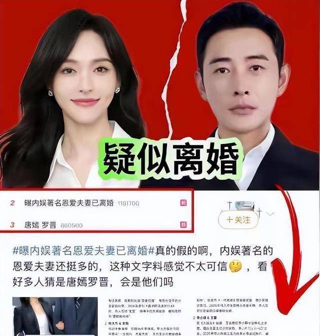 被曝婚变 两人的婚变是卓伟爆料说内娱有一对特别甜蜜的中年夫妻离婚了。 那一看到甜蜜二字就肯定会想到唐嫣和罗晋,唐嫣每次出现的状态都是顶顶的好,每次罗晋都会被全网夸。